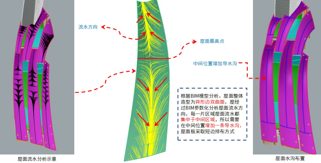 异形双曲面屋面的排水,如同在流动的曲面上规划路径,难度极大。项目团队通过 BIM 参数化分析,摸清了每一片区域的流水轨迹 —— 雨水多集中于屋面中间区域,若按常规设计极易引发积水渗漏。