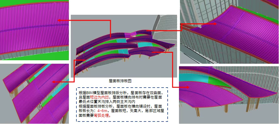 屋面板的铺设,是让双曲面形态落地的关键一步。由于屋面存在双向弯弧,若采用长向排布,部分屋面板根本无法加工成型,且会导致檩条跨度超标、成本剧增。