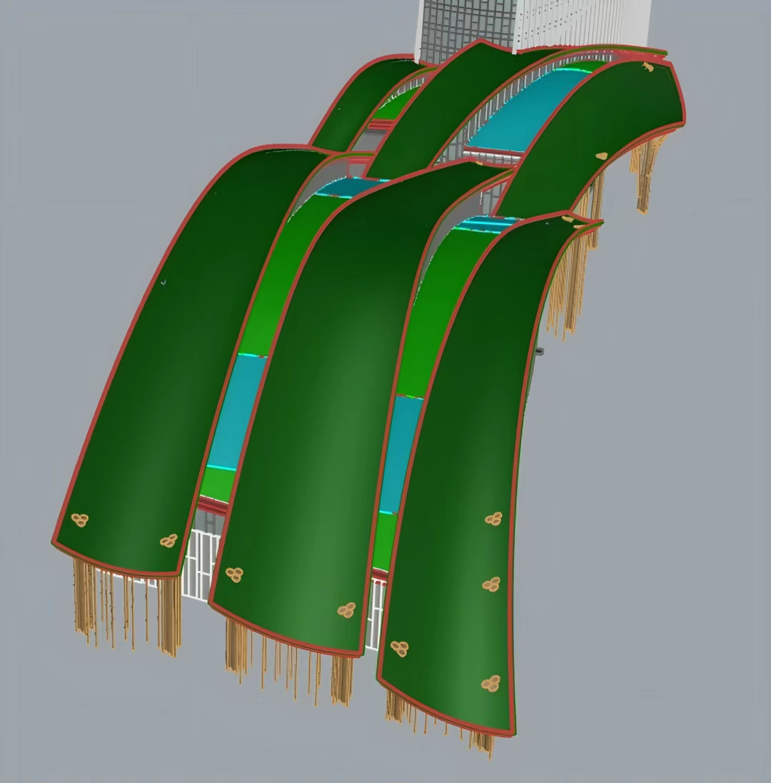 项目初期,会议区、商业区等区域的屋面构造空间,远不能满足原设计的施工需求,常规方案根本无法落地。雅百特团队没有墨守成规,而是通过钢结构模型与犀牛模型的精准合并分析,重新规划构造高度,将结构面向上合理偏移,预留出充足的施工空间,既保证了各构造层的完整铺设,又不破坏建筑整体造型的流畅性。