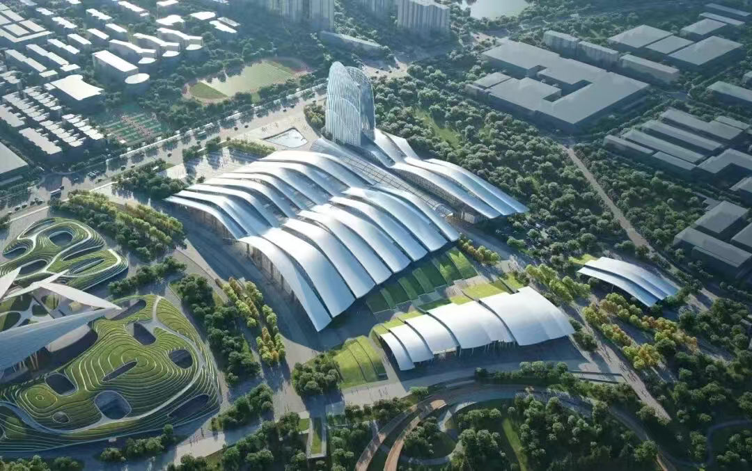 这座会展中心的屋面,最动人之处莫过于那舒展流畅的双曲面形态。它不像常规建筑那般方正规整,而是循着山水脉络自然起伏,贴合着城市的生态肌理。